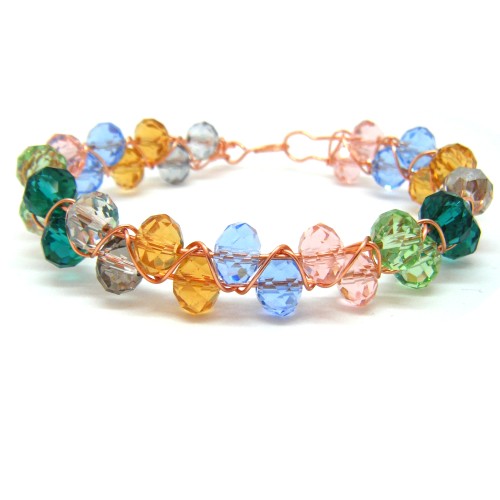 Multi coloured crystals on non-tarnish copper wire bracelet. 17.5 cm