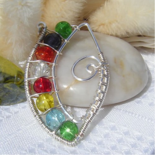 Unique handmade harp design pendant.  Made with non-tarnish silver plated wire and multi crackle glass beads.  Designed to adorn any outfit, day or night.  4cm x 3cm.  Comes with silver plated 16" chain .
