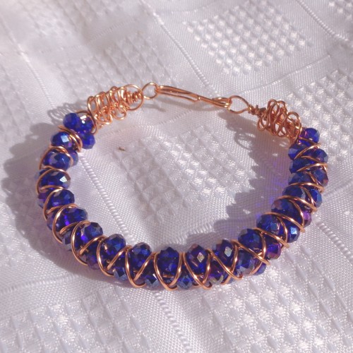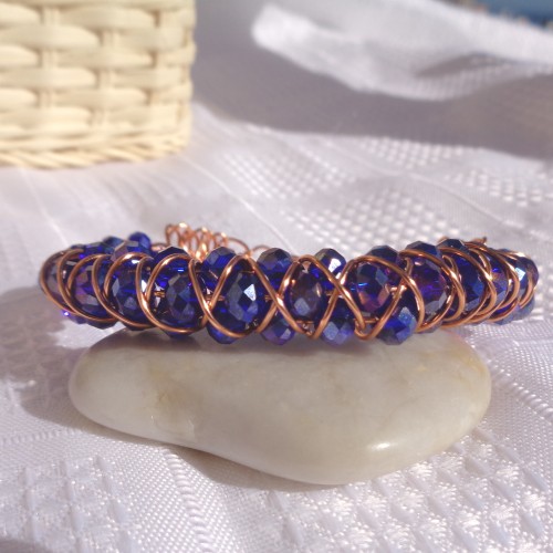 Sparkly multi faceted blue beaded bracelet with non tarnish copper wire wrap. Hook and eye clasp. 17.5cm