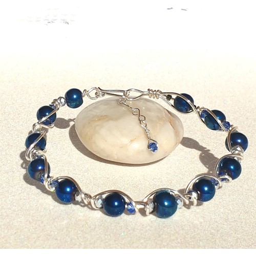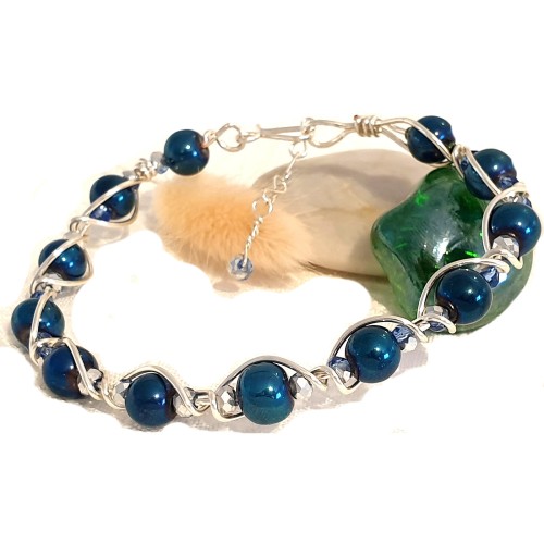 Blue metallic and silver beads captured in a silver plated non-tarnish wire wrap. Complete with extender chain to fit most wrist sizes.